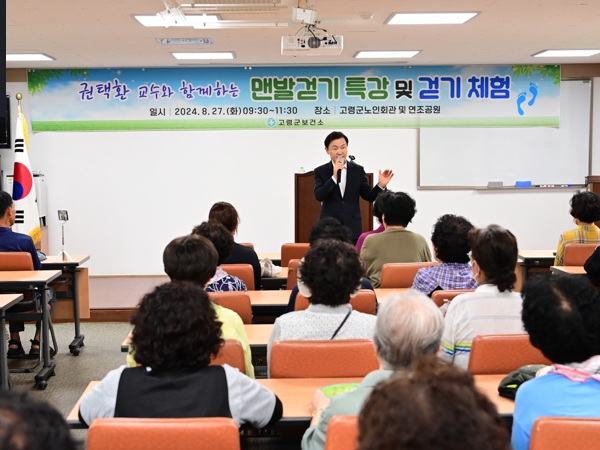 [뉴스서울] 고령군은 전국적으로 불어닥치고 있는 맨발걷기 열풍에 부응하고 고령군 걷기실천율 향상 및 비만율 감소를 위하여 맨발학교 교장 권택환 교수를 초청하여 2024년 8월27일 9시 30분 군노인회관 대회의실에서 맨발 걷기 특강을 실시하고 연조공원에서 걷기대회를 개최했다.