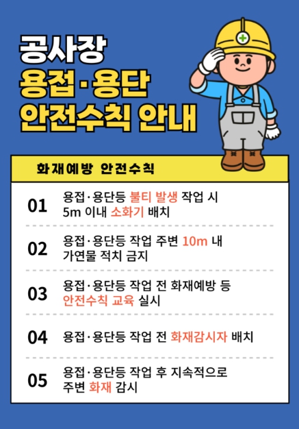 이에 작업자들은 용접ㆍ용단 작업 시 불티로 인한 화재를 예방하기 위해서는 ▲용접ㆍ용단 작업 시 주변 가연물 제거 ▲작업 후 잔여 불씨 확인 ▲작업자 5m 이내 소화기 비치 ▲화재감시자 배치 등 공사장 내 화재 안전수칙을 준수해야 한다.