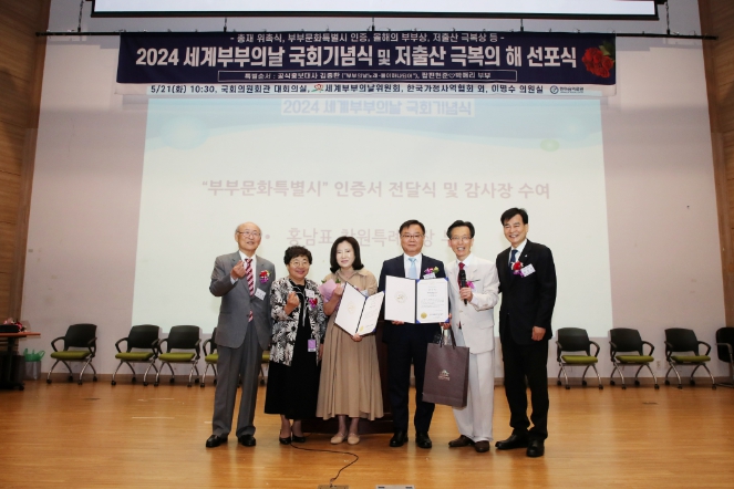 ‘2024 세계부부의 날 국회기념식 및 저출산 극복의 해 선포식’은 세계부부의 날 위원회(총재 하충식, 이사장 허일룡, 대표 권재도), (사)한국가정사역협회, (사)행가래운동본부 주최로 세계부부의 날 30주년 및 국가기념일 제정 17주년을 기념하며 올해의 부부상, 다산 부부상, 국제 부부상 등 수상자와 가족, 위원회 관계자 300여 명이 참석했다.