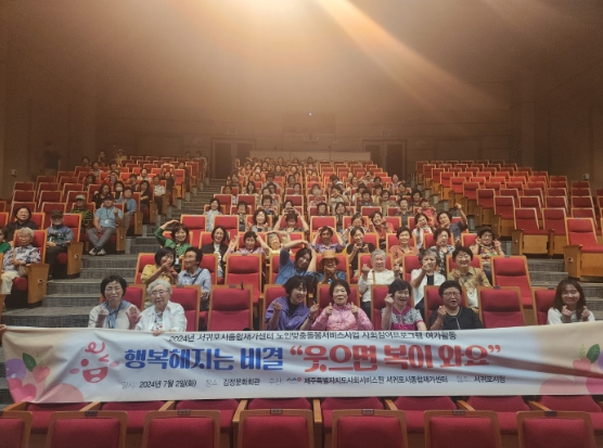 [뉴스서울] (재)제주특별자치도사회서비스원 서귀포시종합재가센터는 지난 2일서귀포시 김정문화회관에서 노인맞춤돌봄서비스 이용어르신과 종사자 120명이 함께 '행복해지는 비결 “웃으면 복이 와요”'웃음치료 강연을 개최했다.