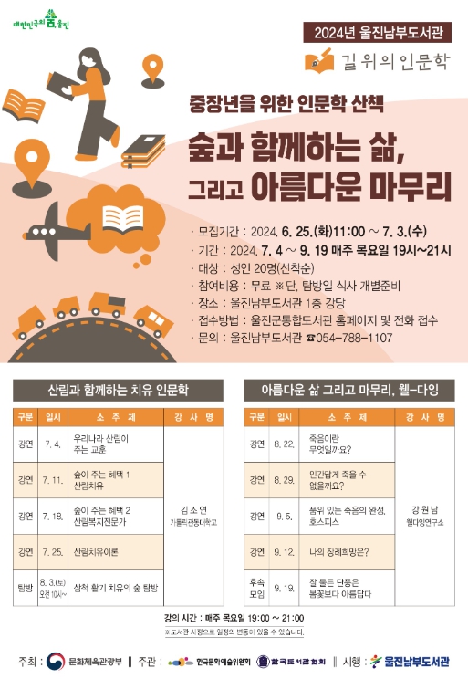‘중장년을 위한 인문학 산책: 숲과 함께하는 삶, 그리고 아름다운 마무리’프로그램은 매주 목요일 오후 7시부터 후포면 울진남부도서관 1층 강당에서 열릴 예정이며, 탐방과 후속 모임은 별도 일정으로 운영된다.