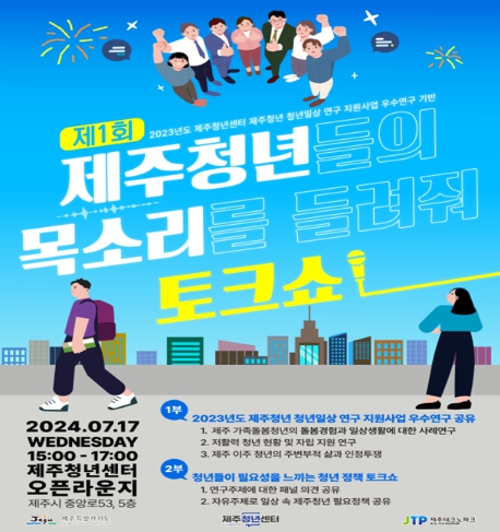 [뉴스서울] 제주특별자치도와 제주청년센터(제주TP산하)가 오는 17일 15시 제주청년센터 5층 오픈라운지에서 제1회'제주청년들의 목소리를 들려줘'토크쇼를 개최한다고 밝혔다.
