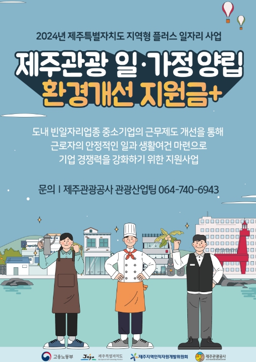 제주특별자치도와 제주관광공사에서 지원하는‘제주관광 일·가정양립 환경개선지원금’은 고용노동부의 2024년 지역형 플러스사업의 공모사업으로 도소매업, 숙박음식업 등 관광관련 중소기업의 근무제도 개선을 위해 유연화제도 적용 기업에게 △간접노무비 △근로자 교통·주거비 △근태관리시스템 인프라 구축 △가족친화제도 컨설팅 등을 지원한다.