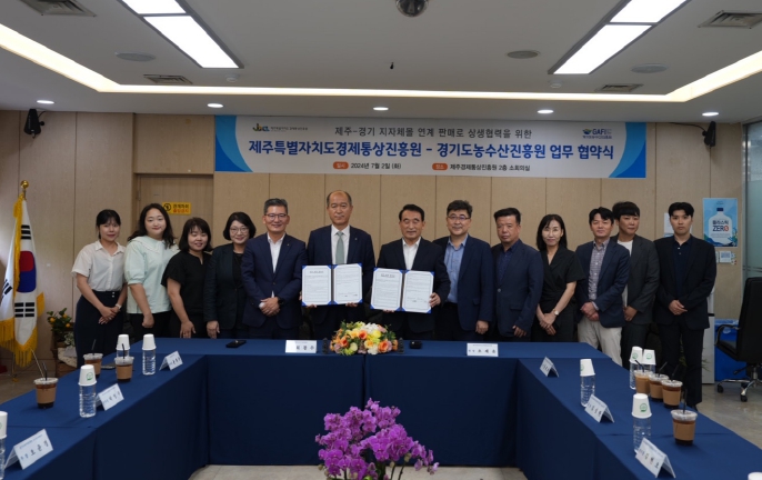 제주경제통상진흥원에서 진행된 이번 협약식은 제주특별자치도경제통상진흥원 오재윤 원장, 경기도농수산진흥원 최창수 원장, 농협중앙회 제주본부장 윤재춘 등 관계자 12명이 참석한 가운데 진행됐다.