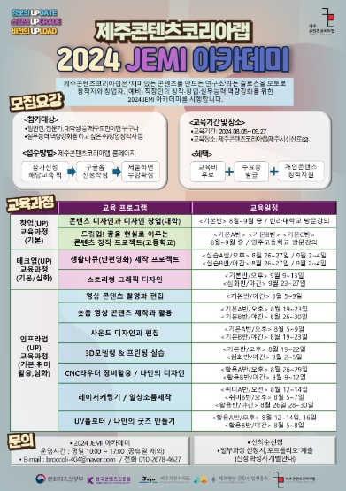 2024 'JEMI아카데미'는 도내 콘텐츠 전문인력 양성을 목적으로 제주콘텐츠코리아랩에서 매년 진행 중인 사업으로, 지역 내 창작․창업자를 대상으로 콘텐츠 창작 전문성 강화 및 콘텐츠 자생력을 확보하기 위해 분야별 교육 프로그램을 꾸준히 운영해오고 있다.
