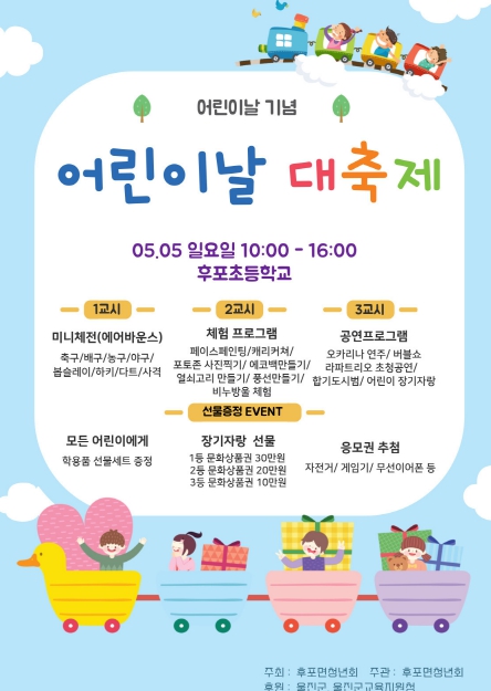 후포면청년회에서 주최하는 후포면 어린이날 대축제 행사는 후포초등학교운동장에서 개최하며 에어바운스 놀이터, 포토존, 열쇠고리, 풍선만들기 등 다양한 체험 공간이 운영될 예정이다.