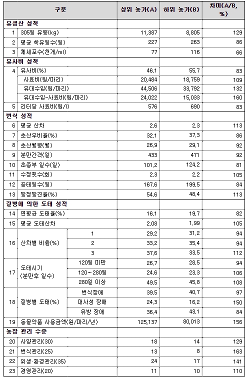또한, 상위 농가는 젖소의 초산 월령이 26.9개월로 하위 농가보다 2.2개월이 짧았고, 분만간격은 433일로 38일 짧았다.