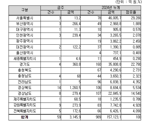 지역별로는 경상북도 1,260억 원,경기도 361억 원, 경상남도 279억 원, 그 밖의 지역이 1,244억 원이다.