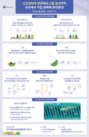 국립산림과학원은 농림위성 정보를 체계적으로 활용하기 위한 전담기관으로 산림위성센터를 신설했다. 산림위성센터는 2025년 발사 예정인 농림위성 정보와 산림환경 빅데이터를 첨단 인공지능(AI) 기술로 융복합해 정밀 디지털 산림관리 체계를 견인하는 것을 목표로 한다.