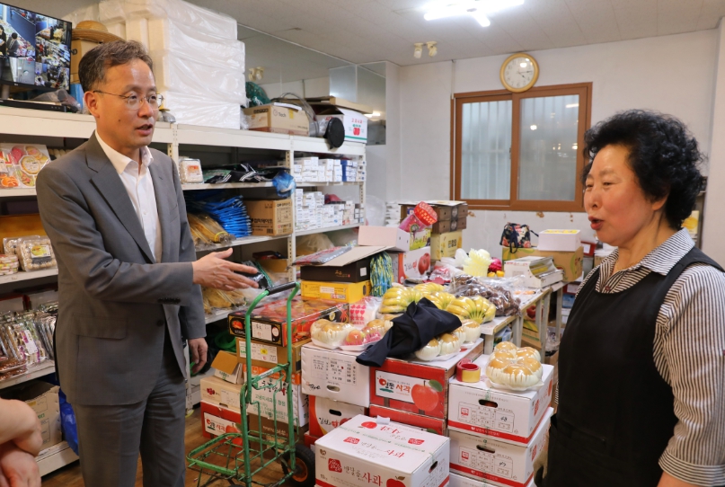 ▲ 이형일 통계청장이 대전 동구 신도시장을 방문해 주요 성수품인 과일 물가 동향을 파악하고 있다. |