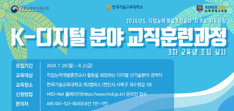 [뉴스서울] 고용노동부 한국기술교육대학교 부설 능력개발교육원은 2024년 제3차 직업능력개발훈련교사 K-디지털 분야 교직훈련과정 교육생 50명을 7월 29일부터 8월 2일까지 모집한다.