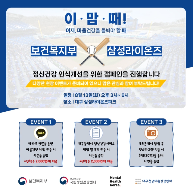 [뉴스서울] 보건복지부·국립정신건강센터는 8월 13일 대구 삼성라이온즈파크에서 프로야구단 삼성라이온즈와 멘탈헬스코리아가 주최하는 정신건강 인식개선 캠페인 '이 맘 때! DAY'를 진행한다.