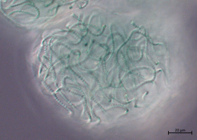 ▲ 2-메틸이소보르네올을 생산하는 노스톡 속 HNIBRCY4 현미경 사진 |