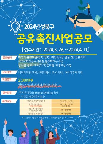 2024 성북구 공유촉진 사업의 모집기간은 3월 26일부터 4월 11일까지이며, 담당자 전자우편을 통해 접수하면 된다.