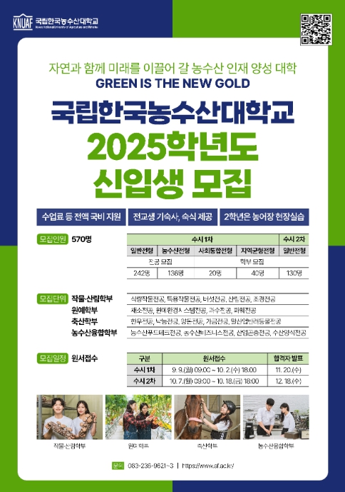 한편, 한농대는 오는 9월부터 2025학년도 신입생 수시 모집이 시작된다. 모집인원은 570명으로 수시 1차는 440명(일반 242, 농수산 138, 사회통합 20, 지역균형 40), 수시 2차는 일반전형으로 130명을 모집한다. 1차 원서접수는 9월 9일부터 10월 2일까지이며, 2차는 10월 7일부터 10월 18일까지 진행한다.