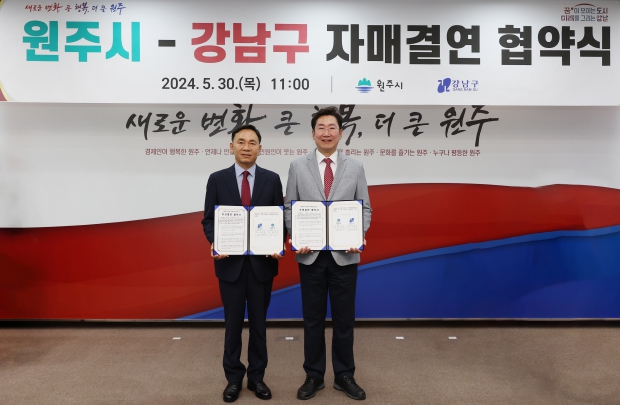 조성명 강남구청장은 “'새로운 변화, 큰 행복, 더 큰 원주'와 '꿈이 모이는 도시, 미래를 그리는 강남구'가 뜻을 함께해 다양한 분야에서 긴밀한 협력으로 동반성장하고, 나아가 대한민국의 발전을 이끌어가길 바란다”고 밝혔다.