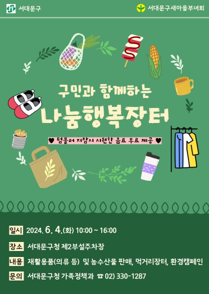 [뉴스서울] 서대문구가 지속가능한 자원 순환과 지역 내 나눔문화 확산을 위해 6월 4일 오전 10시부터 오후 4시까지 서대문 홍제폭포 광장에서 ‘나눔행복장터’를 개최한다.