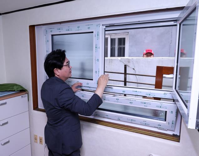 ▲ 박일하 동작구청장이 지난 9일 수해안전디자인을 적용한 개폐형 차수방범창 시범 설치 현장을 찾아 주요 진행사항을 점검하고 있다 |