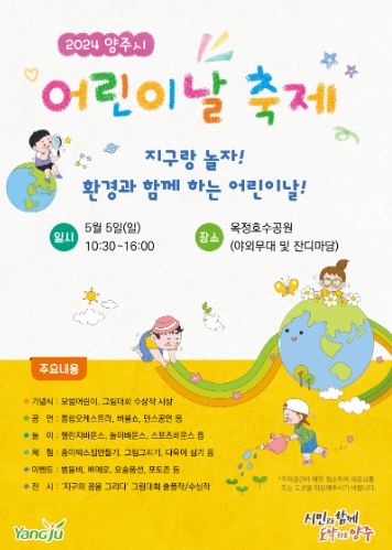 [뉴스서울] 양주시는 어린이날인 5일 오전 10시 반부터 오후 4시까지 옥정호수공원에서 ‘지구야 놀자, 환경과 함께하는 어린이날’을 주제로 ‘양주시 어린이날 축제’를 개최한다고 밝혔다.