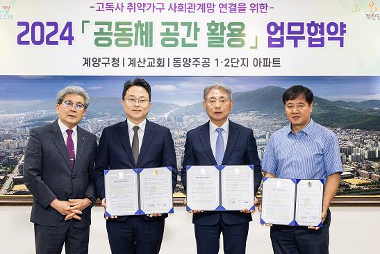 [뉴스서울] 인천광역시 계양구는 19일 고독사 위험군 밀집 지역을 중심으로 사회적 관계망이 취약한 주민을 위한 공유공간 조성 마련을 위해 계산교회, 동양주공 1·2단지 아파트와 업무협약을 체결했다고 밝혔다.
