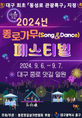 [뉴스서울] 대구 중구는 9월 6일부터 7일까지 종로거리 일원(에스파스-대통조계찜 본점)에서 종로맛길 상가번영회가 주최하고 중구청이 후원하는 ‘2024년 종로 가무(song·dance) 페스티벌’을 개최한다.