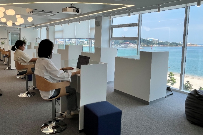 동구워케이션센터 ‘온앤오프’에서는 집중형 근무가 가능한 개인 업무공간 뿐 아니라, 팀별로 자유롭게 소통하고 협업을 유도할 수 있는 분위기의 대·소회의실이 마련되어 있어 직원들의 자발적인 참여와 업무 몰입도를 높일 수 있고, 직원들이 기존 사무실에서 벗어나 아름다운 일산해수욕장과 대왕암공원을 바라보며 새로운 영감을 얻어 업무 효율을 높일 수 있다.