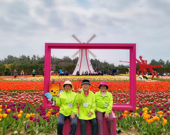 ▲ 지난 11일, 신의면 노인일자리 참여자들이 튤립축제장에서 야외교육 및 문화 활동을 하고 있다. |