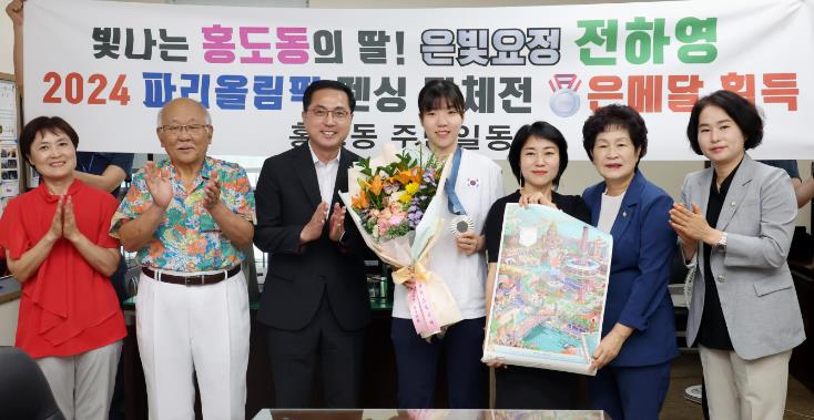 [뉴스서울] 박희조 대전 동구청장이 12일 홍도동 행정복지센터에서 2024 파리 올림픽 여자 샤브르 단체전 은메달을 획득한 ‘전하영’ 선수의 환영 행사를 개최했다.