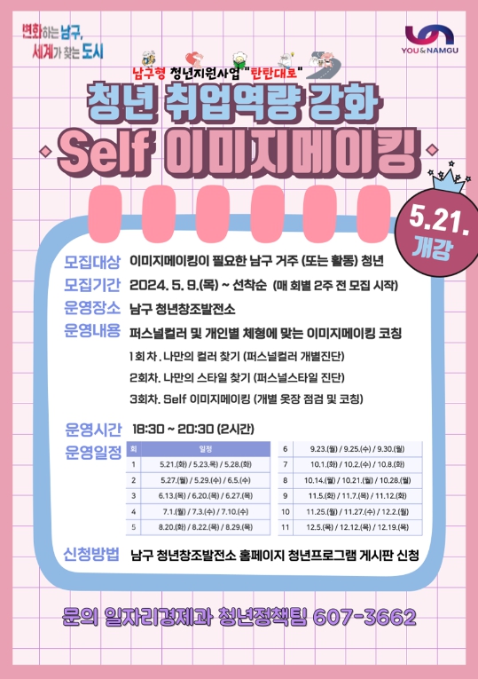 남구 거주 또는 활동 청년을 대상으로 청년창조발전소에서 진행되며 ▲ 나만의컬러 찾기 ▲ 나만의 스타일 찾기 ▲ Self 이미지메이킹으로 구성된 수업을 통해개별 특성에 맞는 이미지메이킹 전반을 코칭해줄 계획이다.