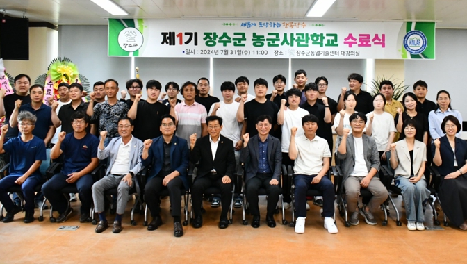 [뉴스서울] 장수군은 지난 31일 농업기술센터에서 대강의실에서 미래 농업을 이끌어갈 스마트팜 전문 인력을 양성하는 ‘농군사관학교 1기 수료식’을 개최했다.