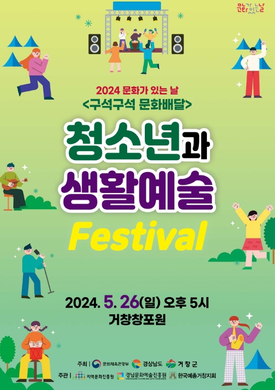 문화배달의 시작을 알리는 첫 공연은 5월 26일 ‘청소년과 생활예술 Festival’의 무대로, 청소년 동아리 ‘SOUL, ICIS’, 직장동아리 ‘WoW밴드, Police밴드’, 거창국악원 등 5개 팀이 출연하며 약 100분 정도 공연을 펼칠 예정이다.