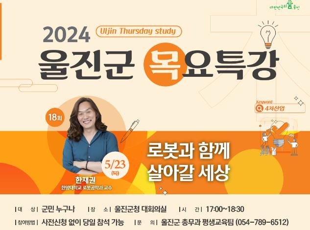 [뉴스서울] 울진군은 오는 23일 군청 대회의실에서 한재권 한양대 로봇공학과 교수를 초청하여‘로봇과 함께 살아갈 세상’이라는 주제로 제18회 목요특강을 개최한다.