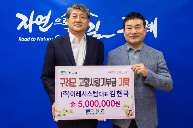 [뉴스서울] 전남 구례군은 (주)이레시스템의 김현국 대표가 지난달 29일 구례군에 고향사랑기부금 최고액인 500만 원을 기탁했다고 밝혔다.