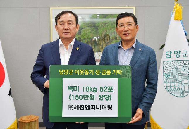 전남 영암군에 본사를 둔 ㈜세진엔지니어링은 전기설계, 신재생 에너지사업 등을 전문으로 하는 기업체로, 담양군 뿐만 아니라 다른 지역에도 장학금 및 고향사랑기부금 전달 등을 통해 꾸준한 사회공헌 활동을 하고 있다.