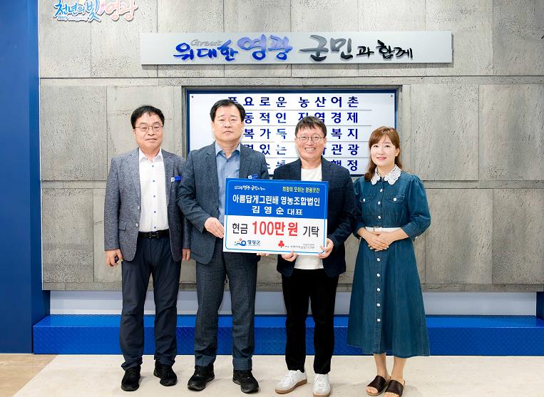 [뉴스서울] 지난 10일 아름답게그린배 영농조합법인은 “제13회 인구의 날 기념 KBS 저출산 극복 프로젝트” 출연료를 포함한 성금 100만 원을 영광군 공식연합모금처인 ‘희망이 모이는 영광곳간’에 기탁하였다.
