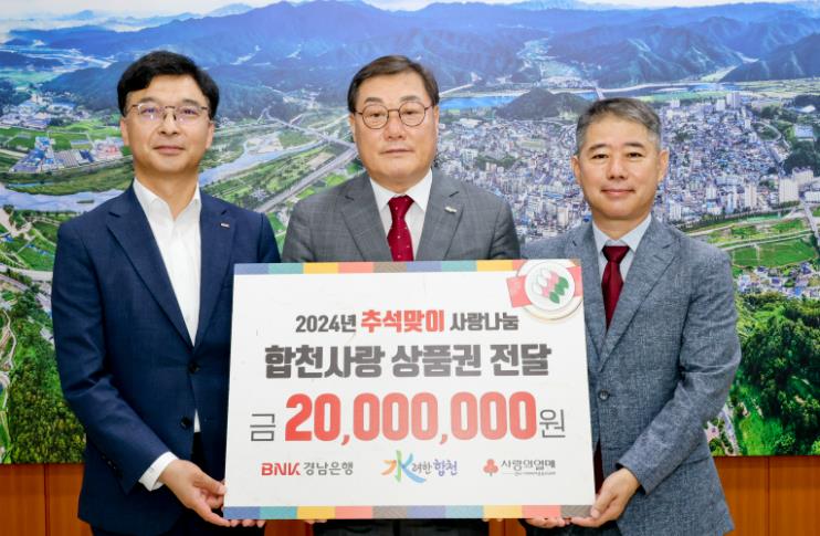 한편 경남은행 합천지점은 2024년 설맞이 생필품 180박스와 여름 쿨매트 150대를 기탁하며 관내 취약계층을 위해 나눔 실천에 앞장서며 더불어 사는 훈훈한 이웃사랑을 실천하고 있다.