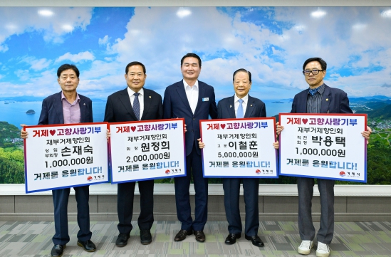 시는 5일 거제시청에서 재부 거제향인회 원정희 회장과 이철훈 고문, 박용택 직전회장 등 임원 13명이 참석한 가운데 고향사랑기부금 기탁식을 가졌다고 밝혔다.