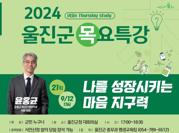 [뉴스서울] 울진군은 오는 12일 울진군청 대회의실에서 윤홍균 정신건강의학과 전문의을 초청하여‘나를 성장시키는 마음지구력’이라는 주제로 제21회 목요특강을 개최한다.