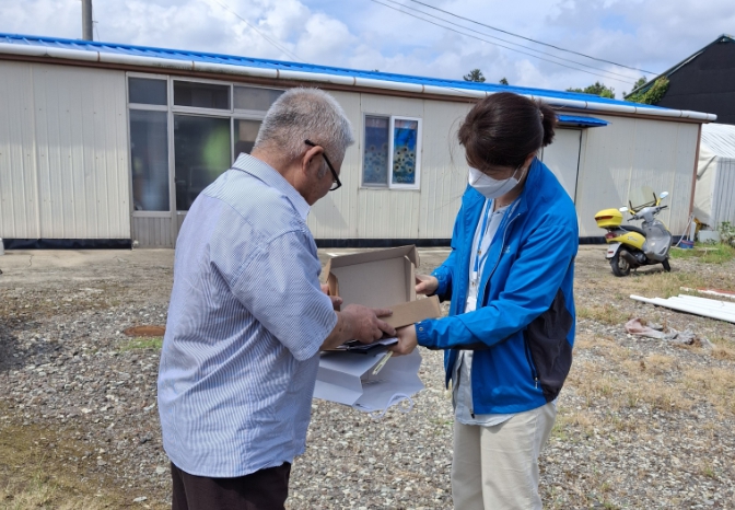 ▲ 혹서기 물품을 배부하고 있는 직원 |