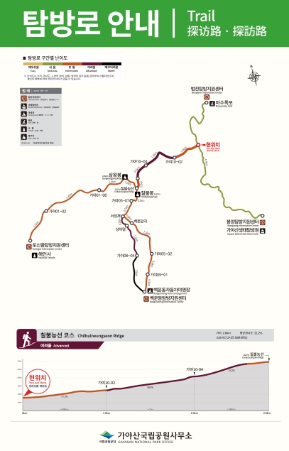 개방구간은 기존코스인 수륜면 백운동에서 만물상, 상왕봉 코스와 가천면 법전리에서 수륜면 봉양리로 이어지는 가야산선비산수길 제2코스인 가야산 에움길과 연결되는 2.8km구간으로 수려한 경관을 자랑하는‘성주가야산 종주코스’이다.