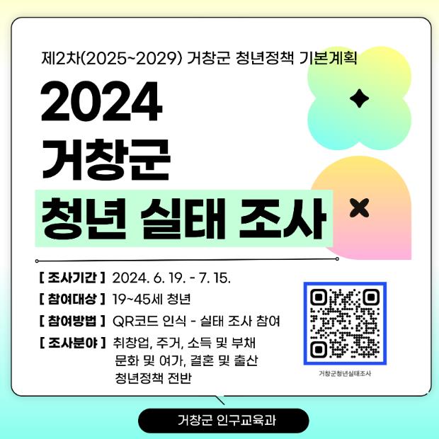 [뉴스서울] 거창군은 제2차(2025부터 2029) 청년정책기본계획 수립에 앞서 청년의 실태와 현황을 파악하기 위한 청년실태조사를 6월 19일부터 7월 15일까지 시행한다.