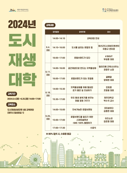 [뉴스서울] 제주특별자치도 도시재생지원센터는 6월 18일 화요일 도시재생상생모루 2층 교육마당에서 ‘2024년 도시재생대학’ 3회차 교육을 진행한다.
