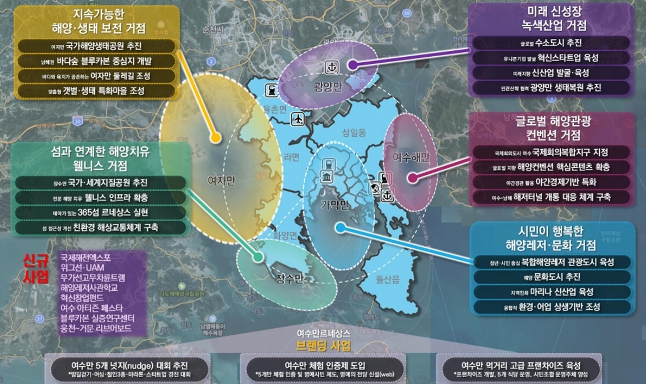 각 만의 특성을 살려 ▲지속가능한 해양·생태 보전거점 ‘여자만’ ▲해양치유 웰니스 거점 ‘장수만’ ▲해양레저·문화 거점 ‘가막만’ ▲해양관광과 컨벤션 ‘여수해만’ ▲미래 신성장 녹색산업 거점 ‘광양만’ 등으로 보전·개발한다.