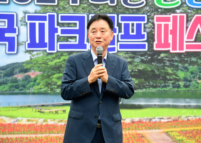 ▲ 2024 화천 산천어 전국 파크골프 페스티벌 1차 예선전이 30일 하남면 거례리 산천어 파크골프장에서 시작됐다. 최문순 군수가 경기에 앞서 선수단에게 인사말을 하고 있다 |