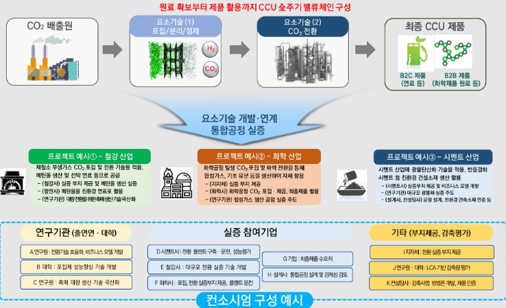 해당 전략의 일환으로 추진되는 ‘CCU 메가 프로젝트’는 ➊연구개발 주체(출연연, 대학 등)는 물론, ➋이산화탄소 발생원이 존재하는 수요기업, ➌CCU 제품 활용 기업, ➍감축량 평가·검증 기관 등이 모두 참여하는 컨소시엄 형태로, 이산화탄소 공급부터 제품 활용까지 이산화탄소 포집·활용 전주기 밸류체인을 구성하여 CCU 비즈니스 모델을 확보하는 것을 목표로 대규모 실증을 지원하는 사업이다.