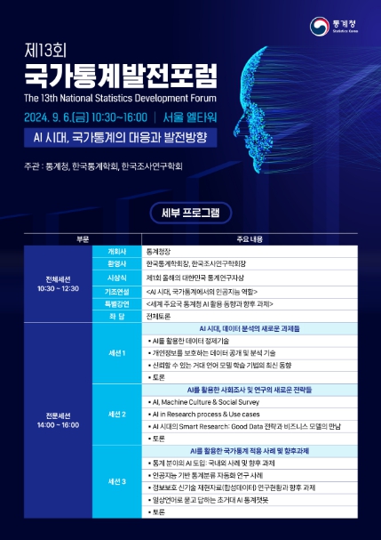 [뉴스서울] 통계청은 '제13회 국가통계발전포럼'을 9월 6일 서울 엘타워에서 한국통계학회(회장 김동욱), 한국조사연구학회(회장 서우석)와 공동으로 개최했다.