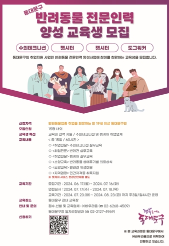 [뉴스서울] 서울 동대문구가 7월 16일까지 ‘반려동물 전문 인력 양성 사업(1기)’ 참여자를 모집한다.