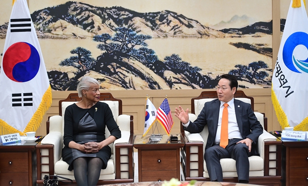 ▲ 유정복 인천광역시장이 28일 G타워 접견실에서 엘비 그레이 잭슨(Elvi Gray-Jackson) 알래스카주 상원의원을 접견하며 협력방안 등을 논의하고 있다. |