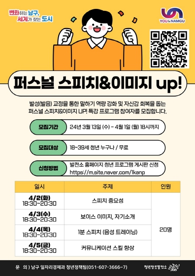 [뉴스서울] 부산 남구는 말하기에 어려움을 겪고 있는 청년에게 발성(발음)교정을 통해 호감을 주는 말하기 역량을 강화하여 자신감을 높여주고, 청년사업가에게는 커뮤니케이션 스킬과 비즈니스 매너를 향상시켜 사회진출에 도움을 주고자“퍼스널 스피치&이미지 up!”특강을 개최한다고 13일 밝혔다.