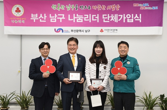 [뉴스서울] 부산 남구는 지난 27일 이룸그룹 송상미 대표와 대연3동 주민자치위원회 장상호 위원장의 나눔리더 가입식을 개최하고 인증패와 뱃지를 전달했다.